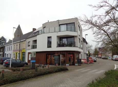 Modern nieuwbouw appartement bestaande uit inkom, living, 2 terrassen(1 overdekt), moderne ingerichte keuken met berging, nachthall, wc, badkamer, 2 slaapkamers, afzonderlijke berging in de kelder.