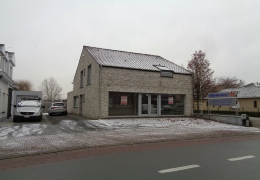 Modern en ruim handelspand / kantoorpand bestaande uit wachtzaal, open handelsruimte, 4 burelen, technische ruimte, kluiszaal, berging, keuken, wc’s.